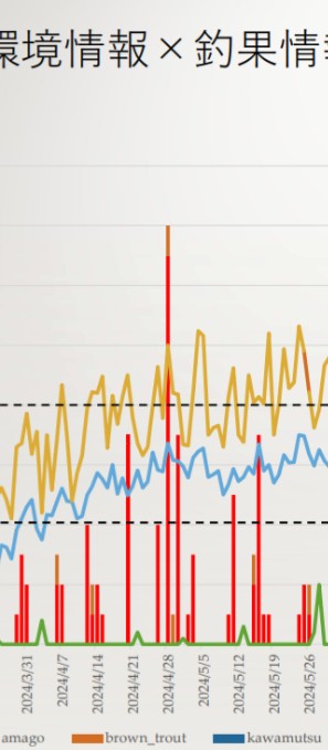 赤い棒線はメンバーからのアマゴの釣果報告(多くが週末)である。